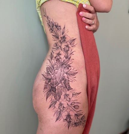 Je suis atteinte d’une maladie neurologique qui ne me permet pas d’avoir un rythme de travail "normal". Je tatoue un jour sur deux : les séances ont lieu les lundi, mercredi et vendredi. Les dessins sont réalisés les mardi et jeudi et envoyés la veille de la séance. Mon organisation et mes horaires ne sont pas négociables, je suis obligée de faire ainsi si je veux encore tatouer de belles années :)